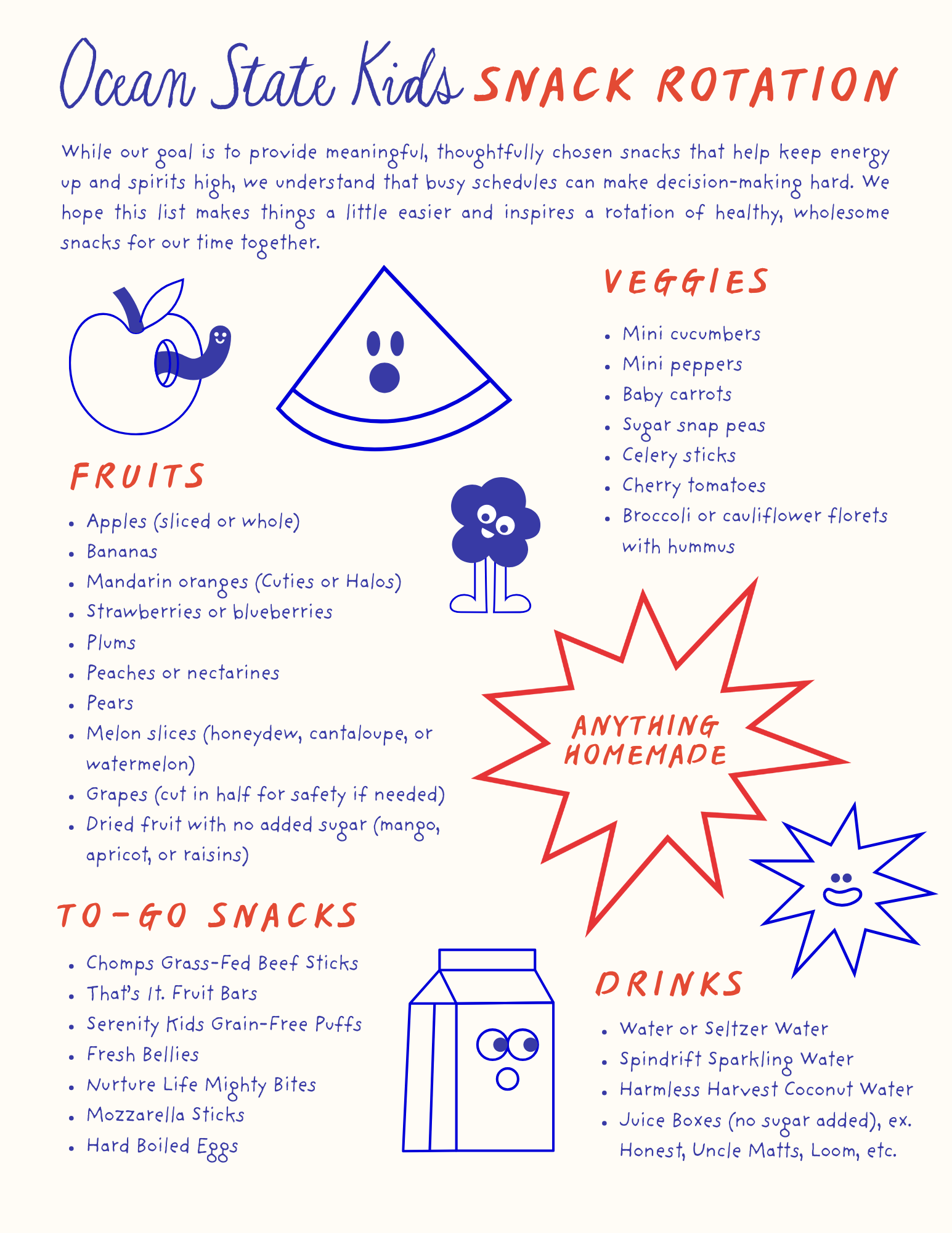 A full list of suggested snacks for your participation in the snac rotation.